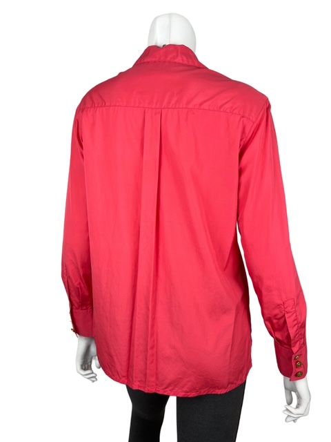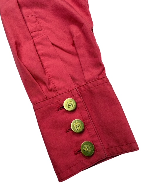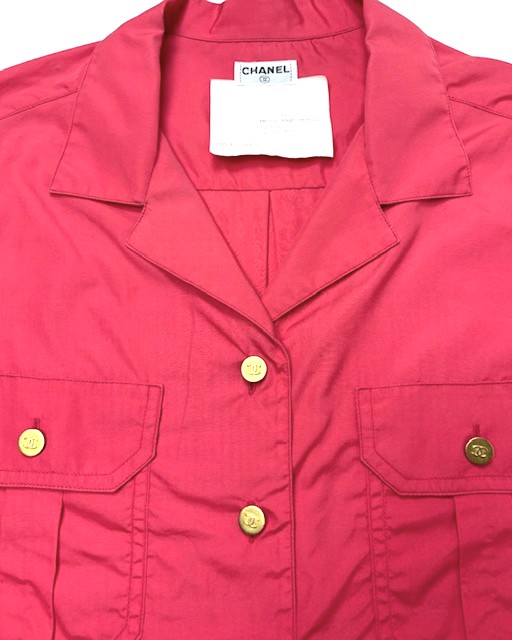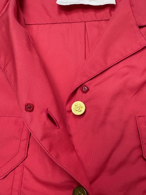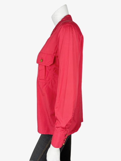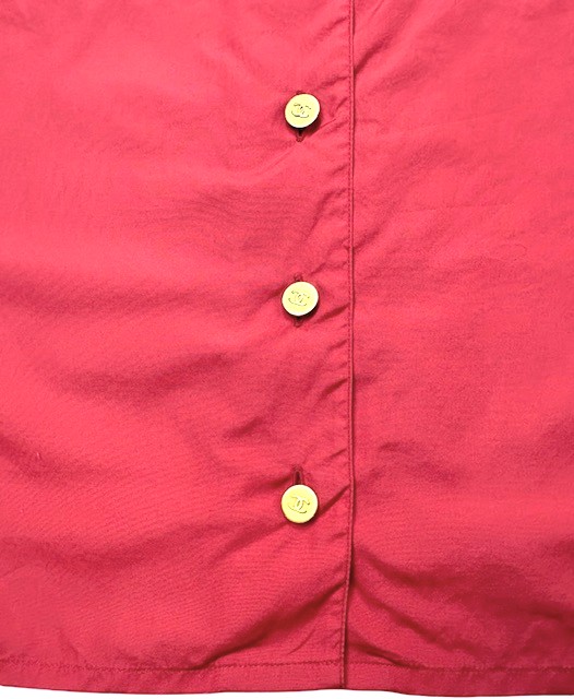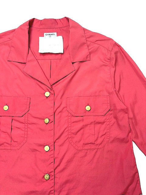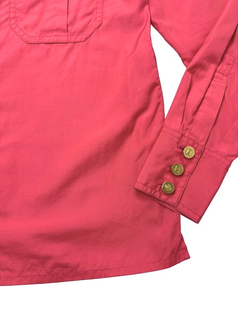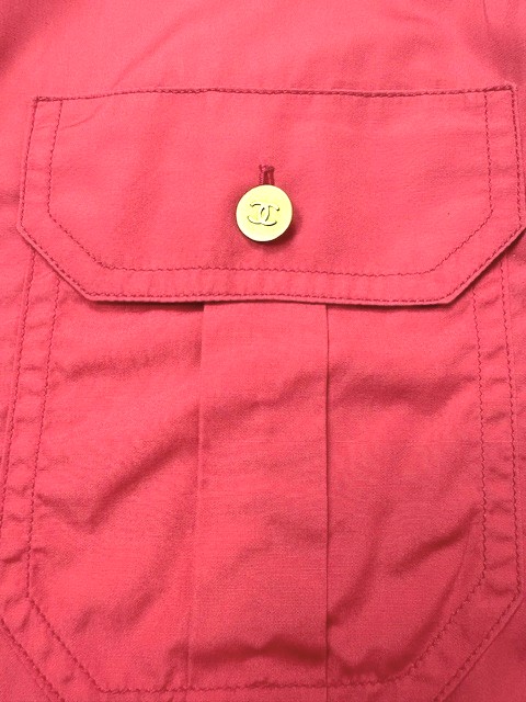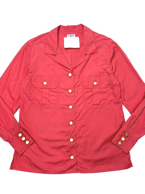 ゴールドCCボタンいっぱいのポケット付コットン開襟ブラウスです。素敵なルージュカラーです♪