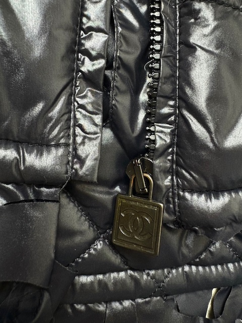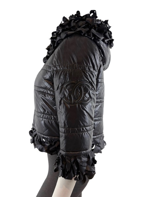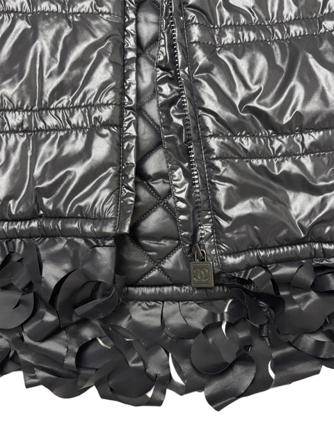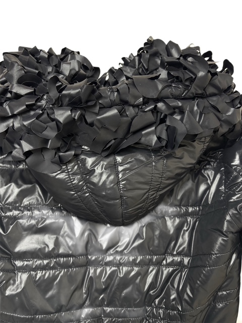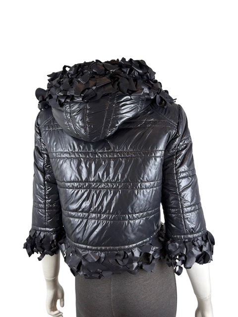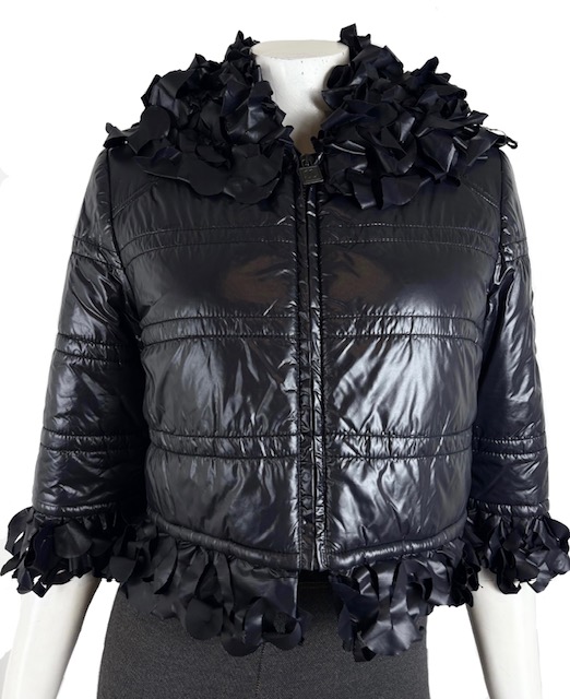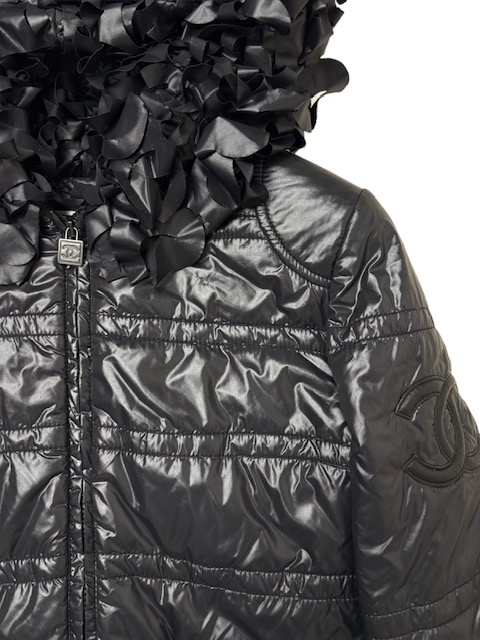 たっぷり花びらフリンジトリミングが付いた中綿フードブルゾンです。左袖に大きめレザーCCマークが入っています♪