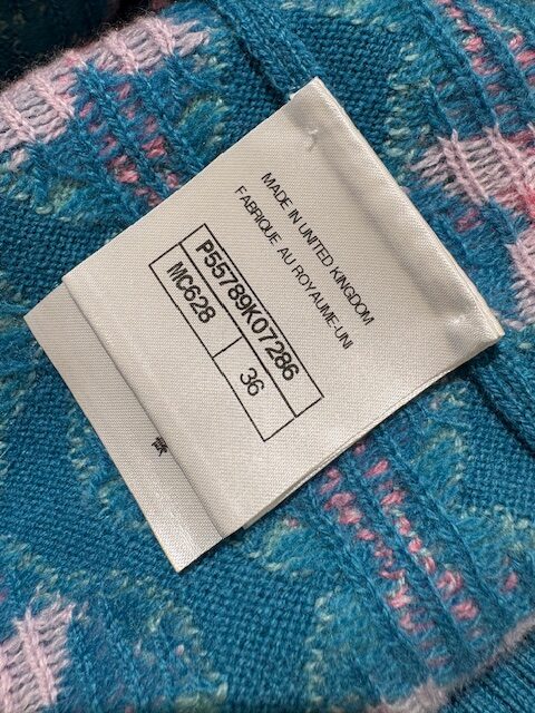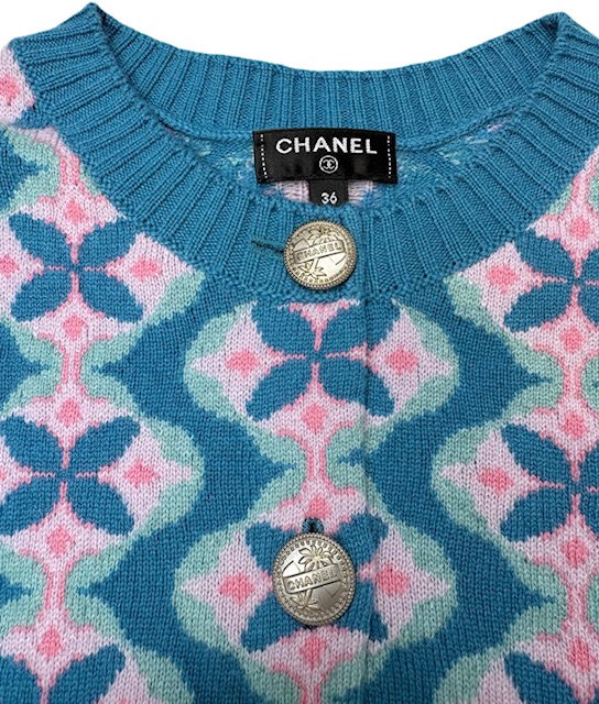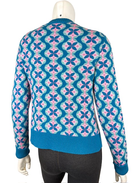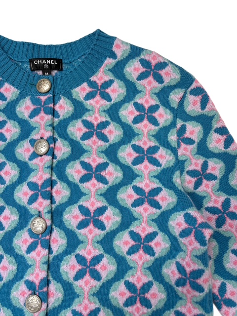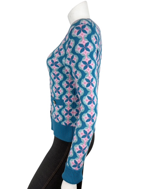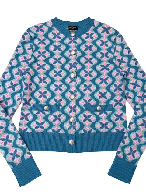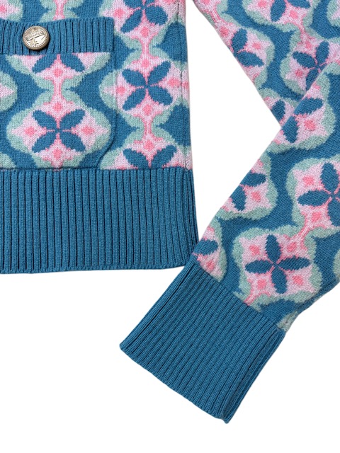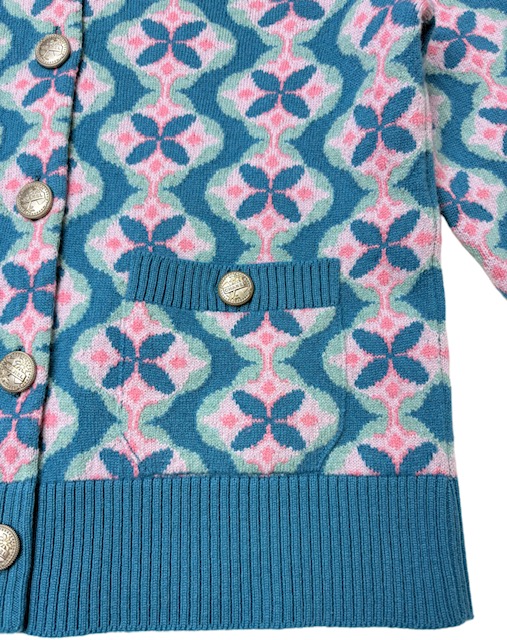 ブルーXピンクのお色合わせが素敵なフラワー柄カシミアカーディガンです。キューバラインのロゴボタンが可愛いです♪