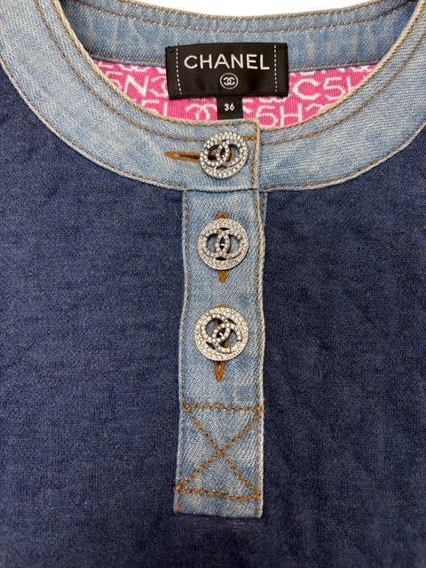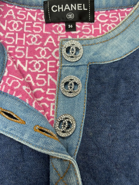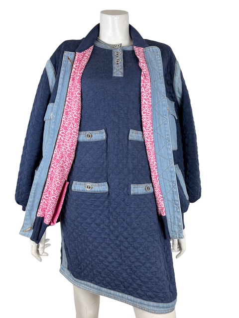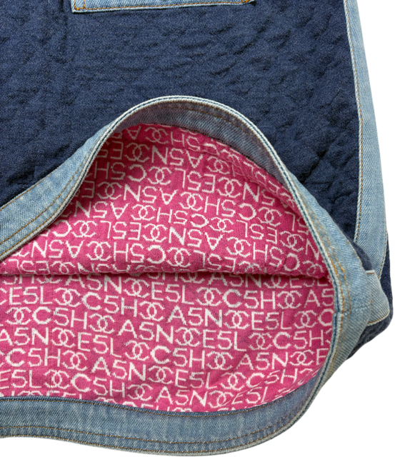 裏地に可愛いピンクロゴ柄が入ったラインストーンCCボタンのデニムトリムキルティングワンピースです♡