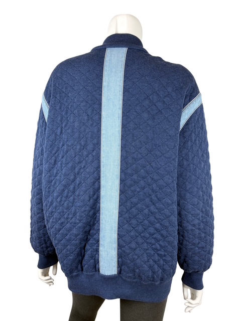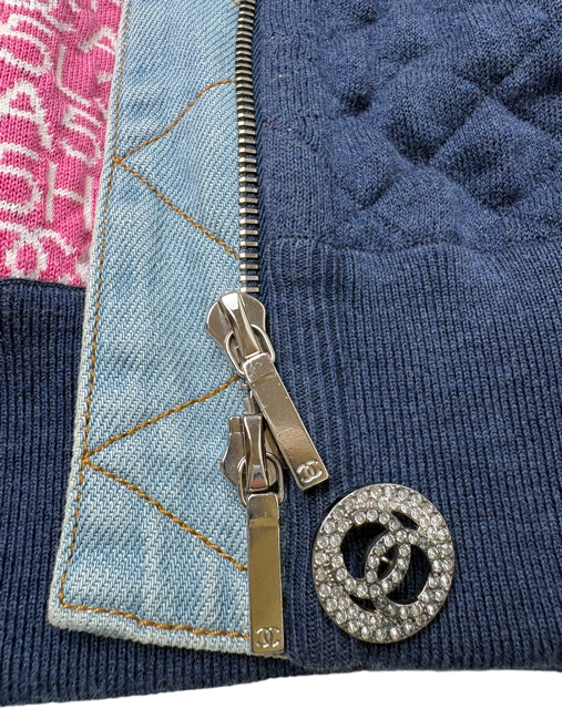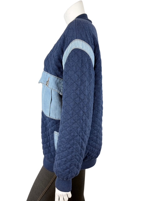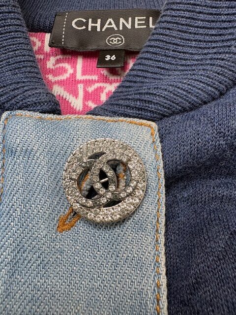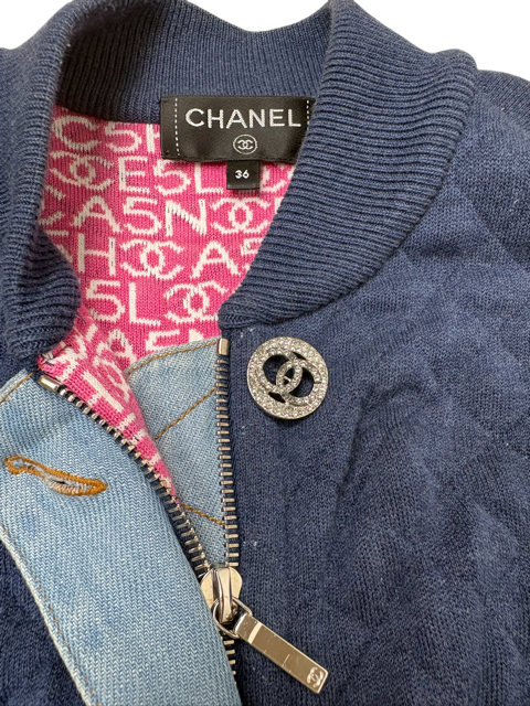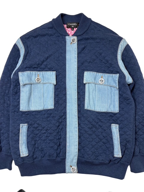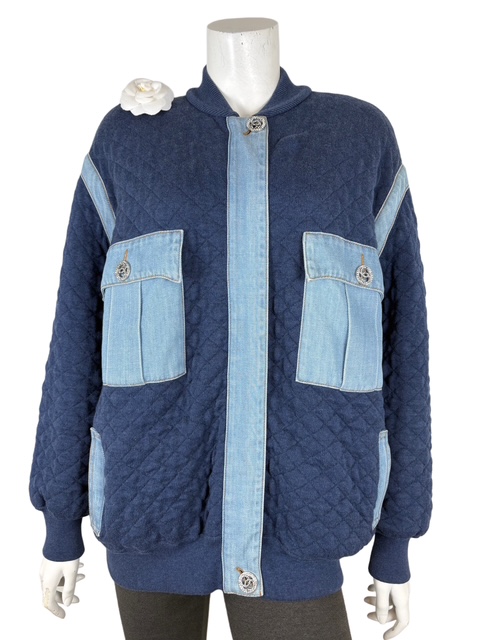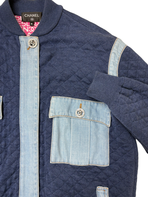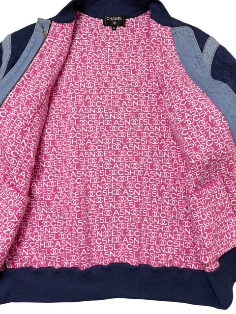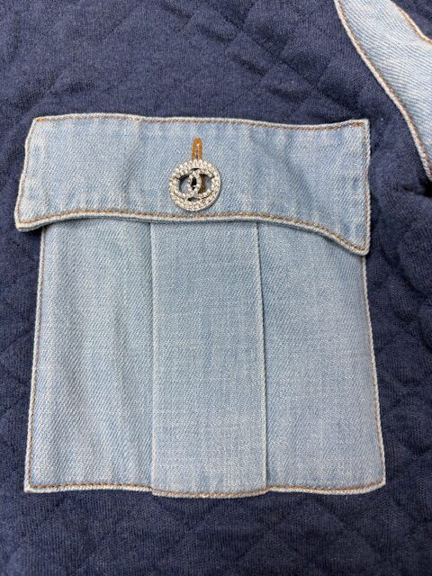 裏地に可愛いピンクロゴ柄が入ったラインストーンCCボタン付ヴィンテージデニムトリムのキルティングオーバーサイズブルゾンです♪