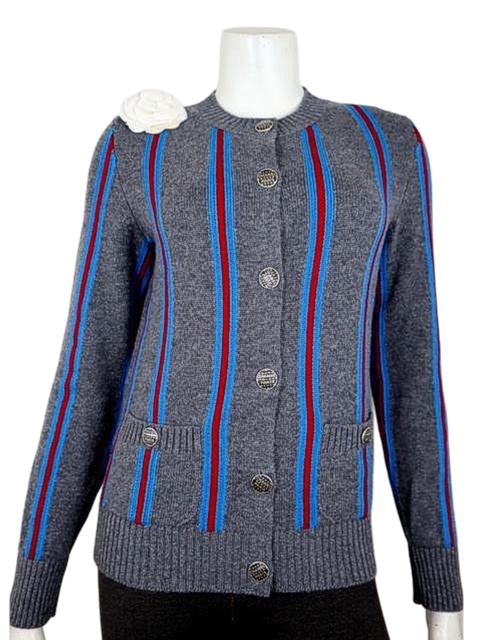 グレーにストライプのお色合わせが可愛い人気のカシミアカーディガンです♪