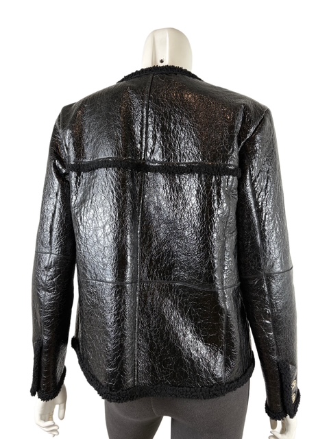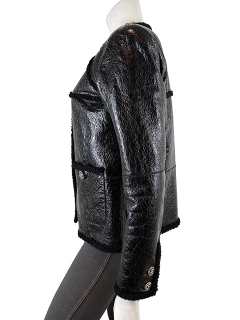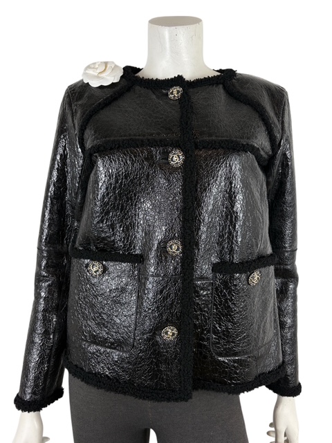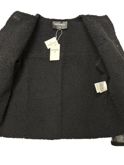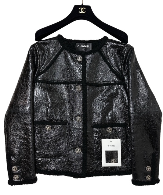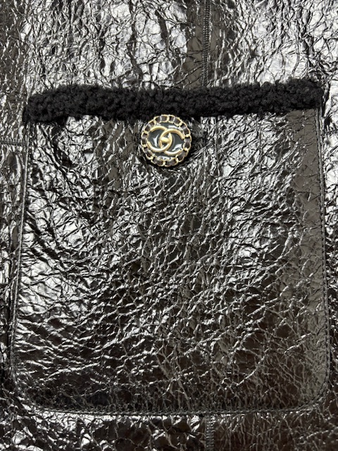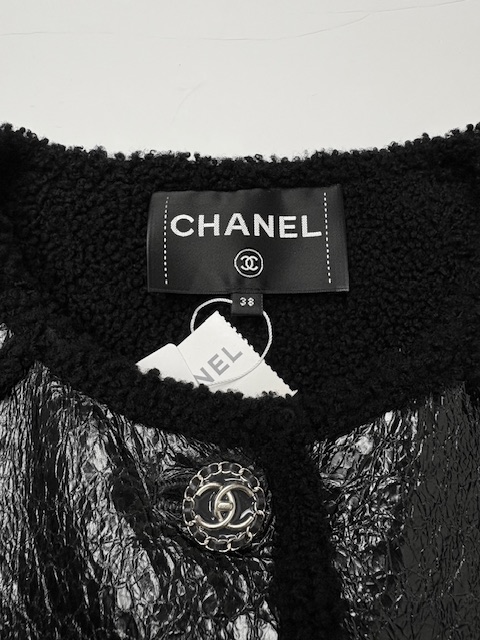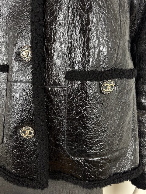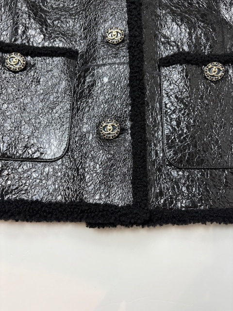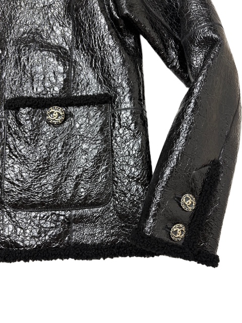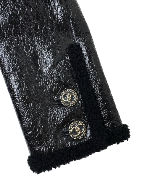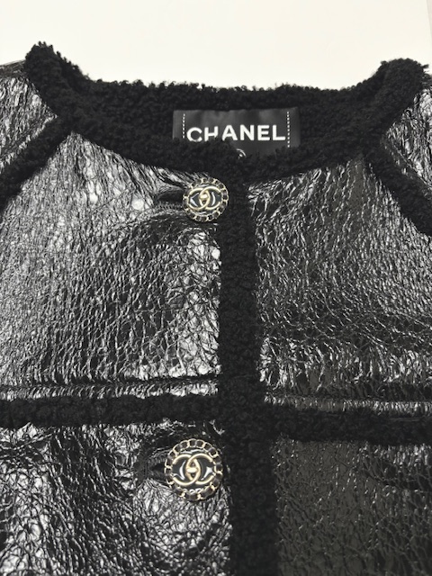 ラグジュアリーなラムシアリングムートン素材のノーカラージャケットです。大きめのCCボタンが素敵です。