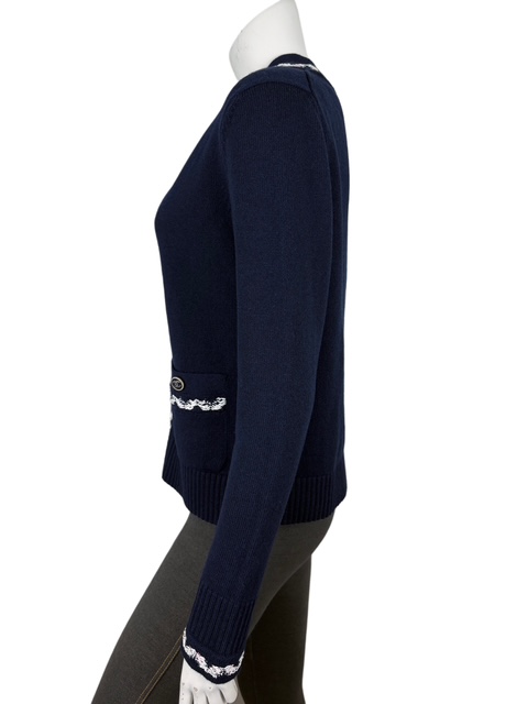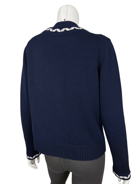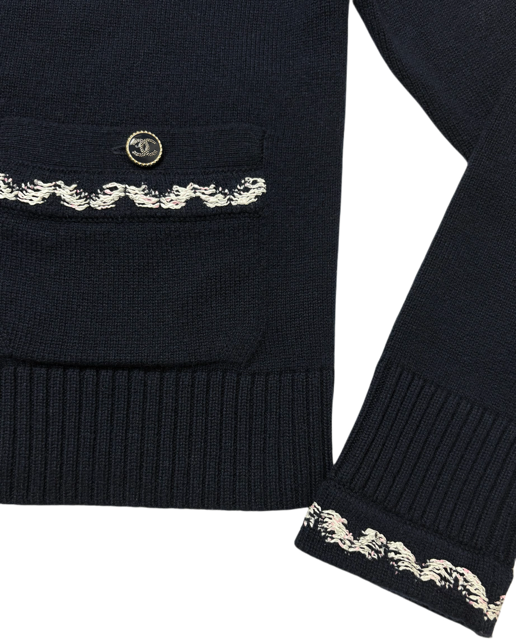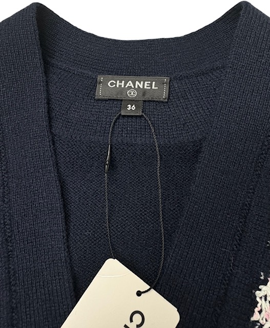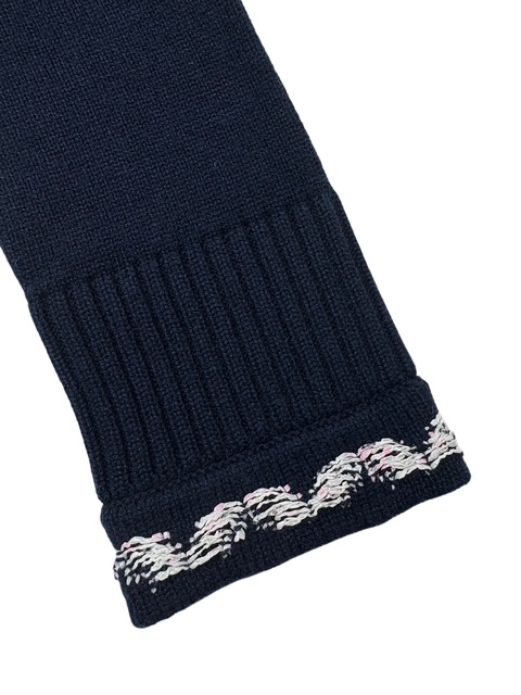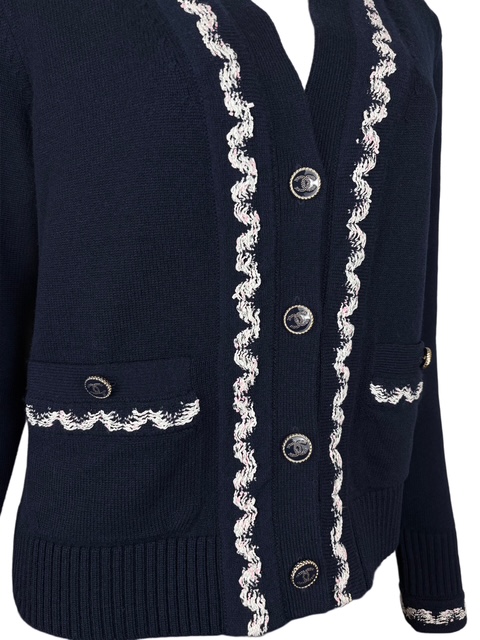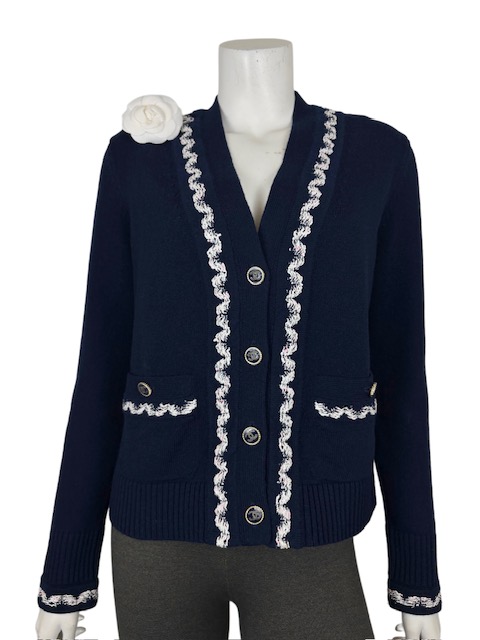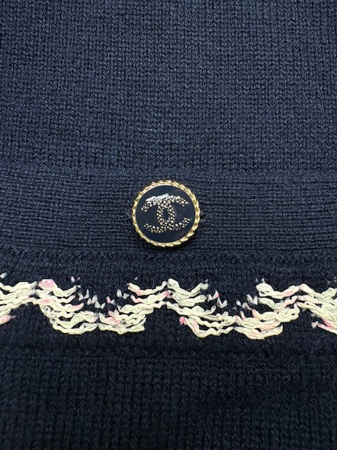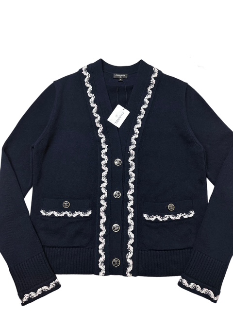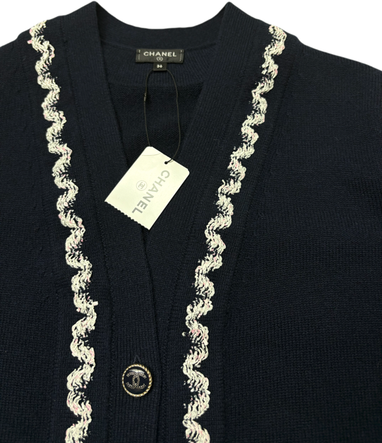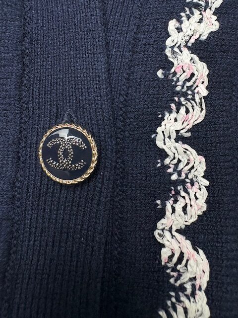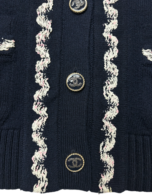 濃紺にシロXピンクのツイード風トリミングが映える人気のカシミアカーCCディガンです。豪華なCCボタンです♪