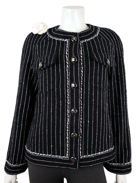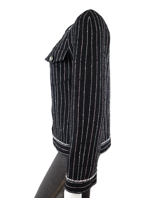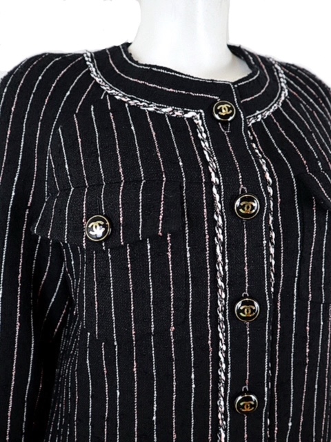CCマークが目立つボタン、可愛いカラーのブレード、繊細なラメステッチと溜息モノの素晴らしいジャケットです。