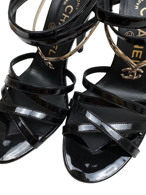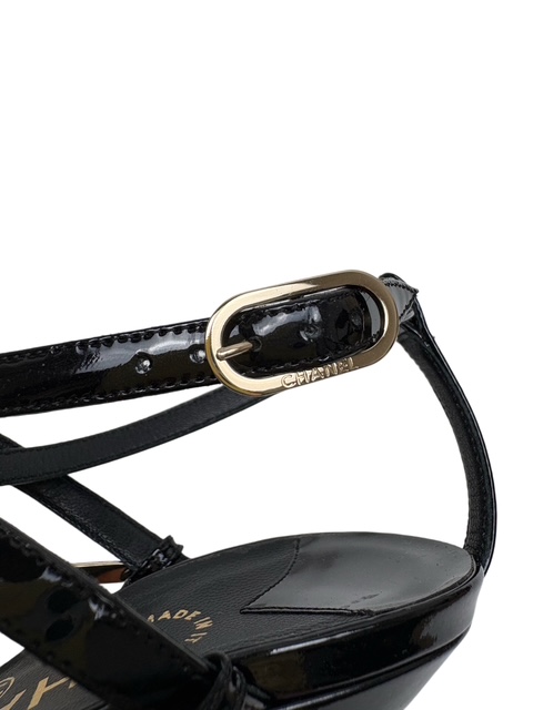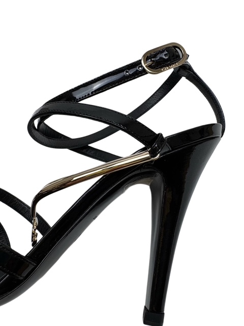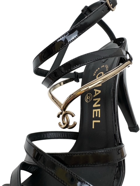 甲部分に豪華なゴールドのCCメタルストラップが付いたエナメルミュールです♪