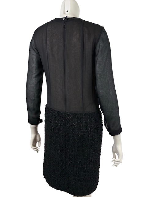 シルク2枚重ねのとろみブラウスとラメツイードコンビのタイ付ワンピースです。きらきらラインストーンCCボタンが素敵です♪