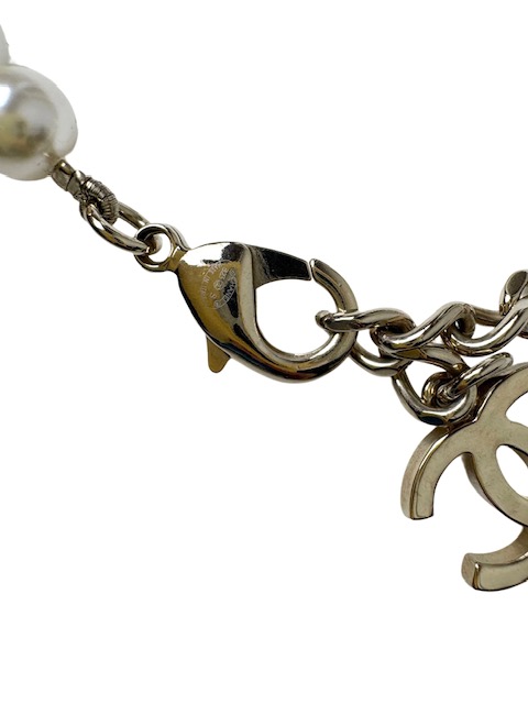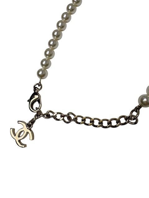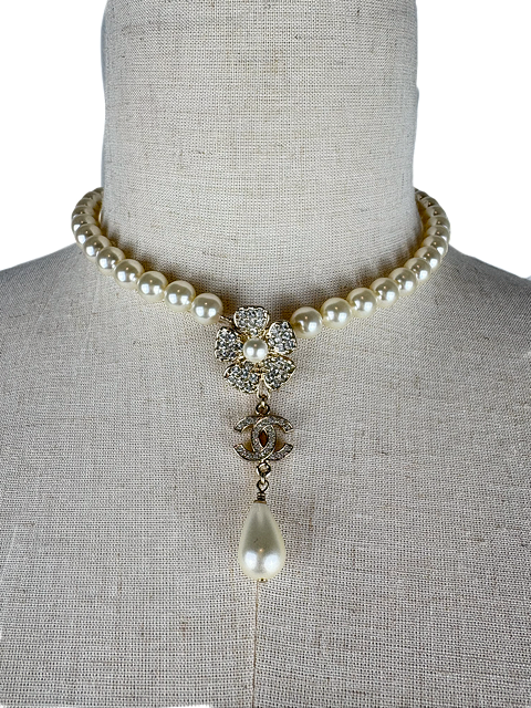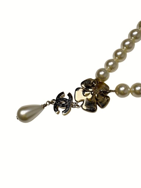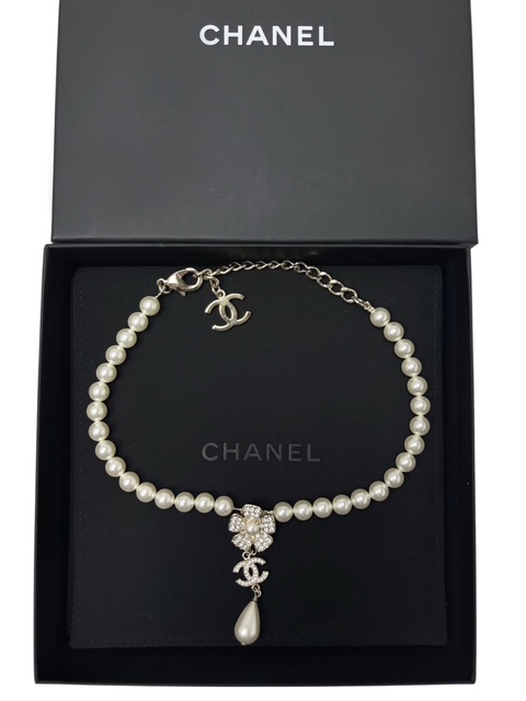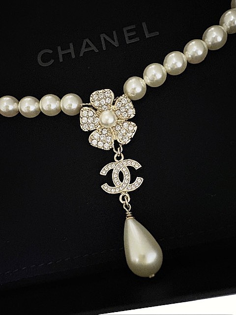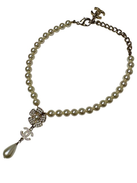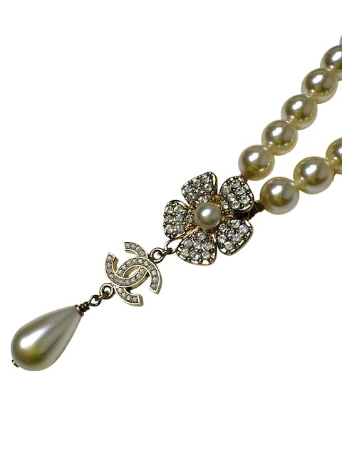 ゴージャスかつ洗練されたデザインのラインストーンCCマーク&カメリア付パールネックレスです♪