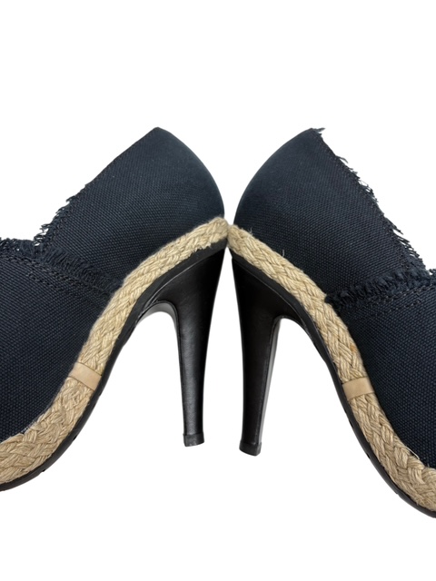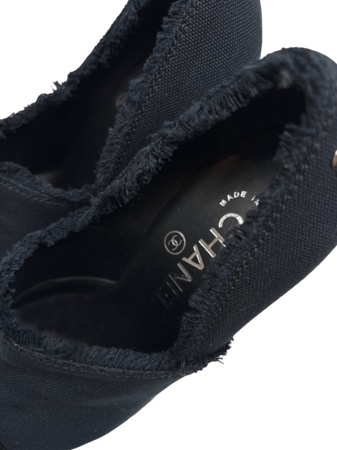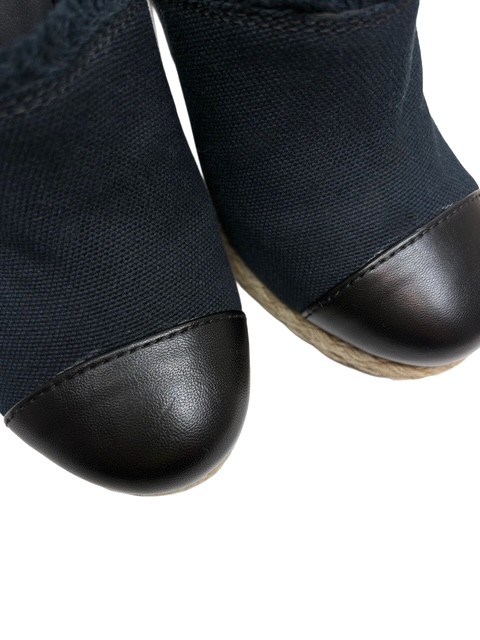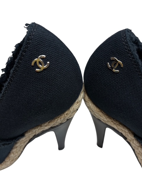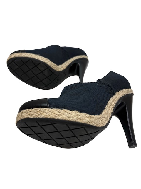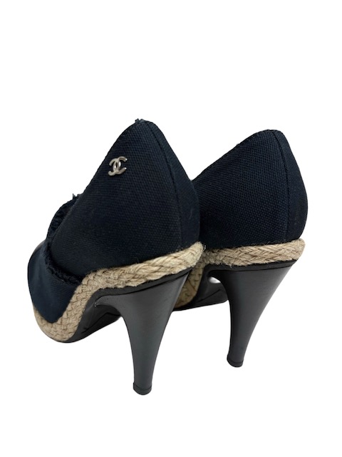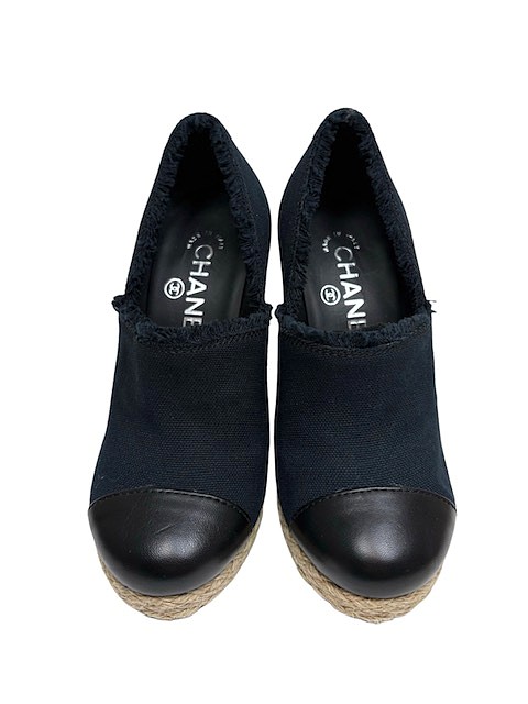 シルバーCCマークが付いたキャンバスXカーフコンビのエスパドリーユパンプスです。