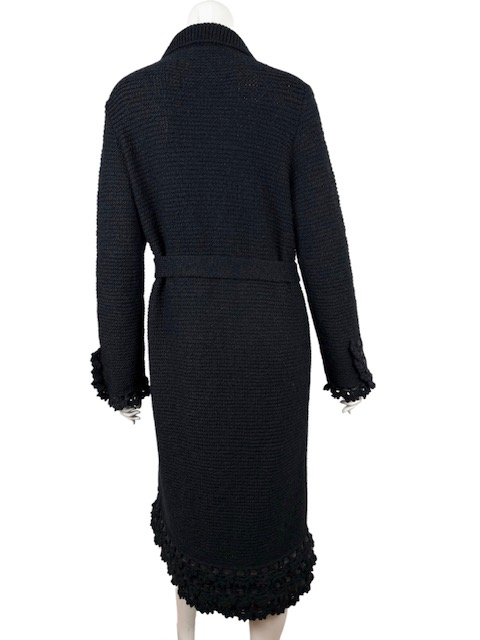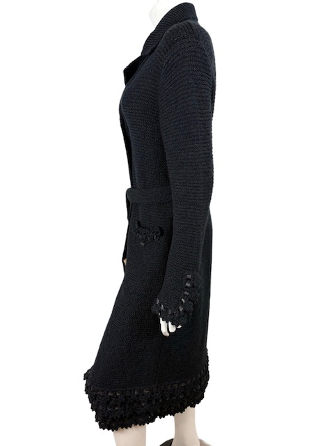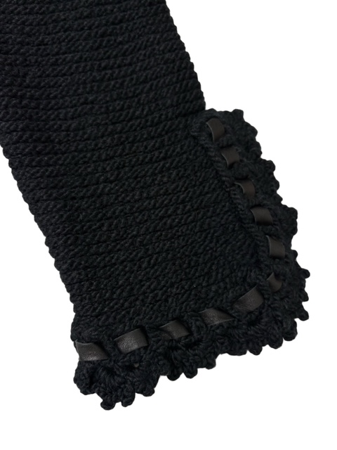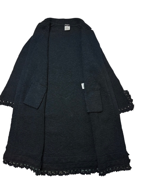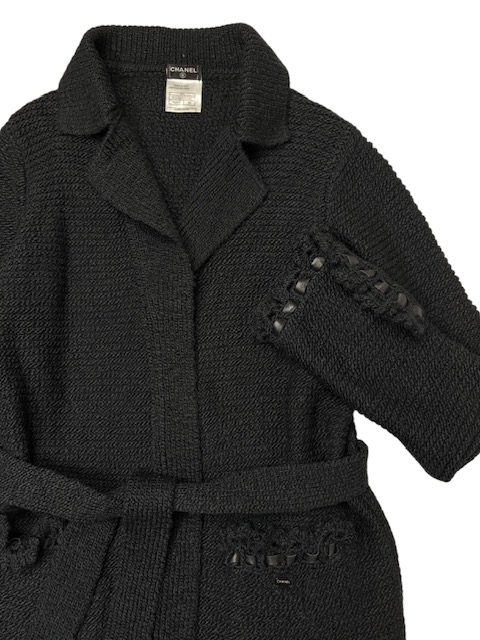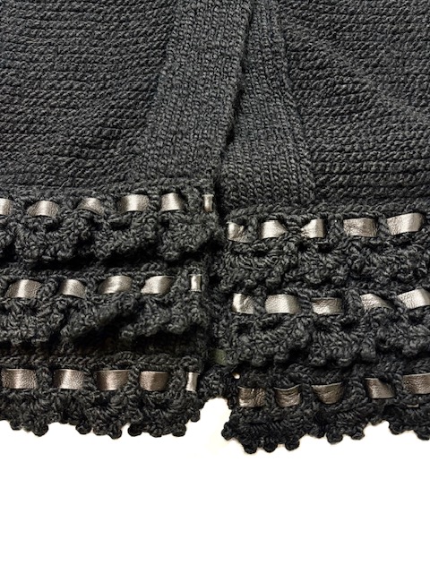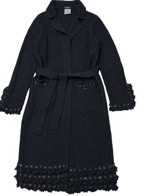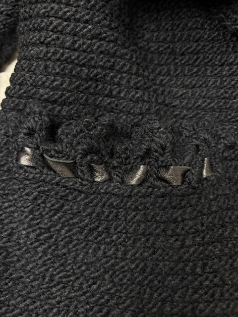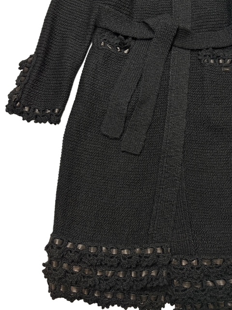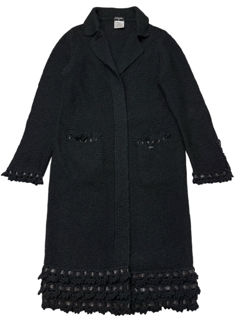レザートリミングが豪華なウールxキャメルヘア混のロングニットコートです。裾は3段フリルで可愛いです♪