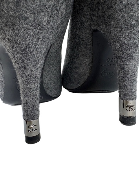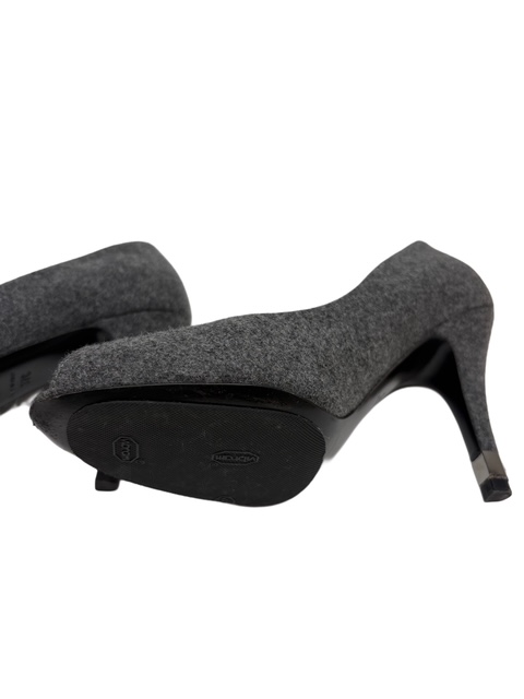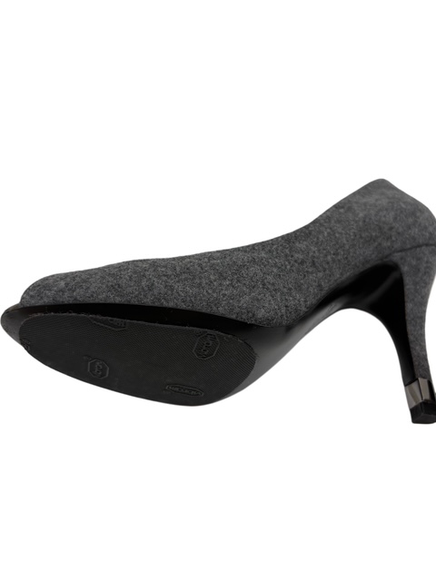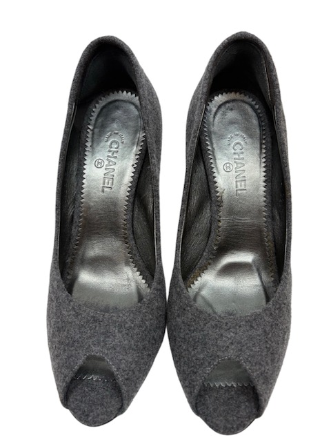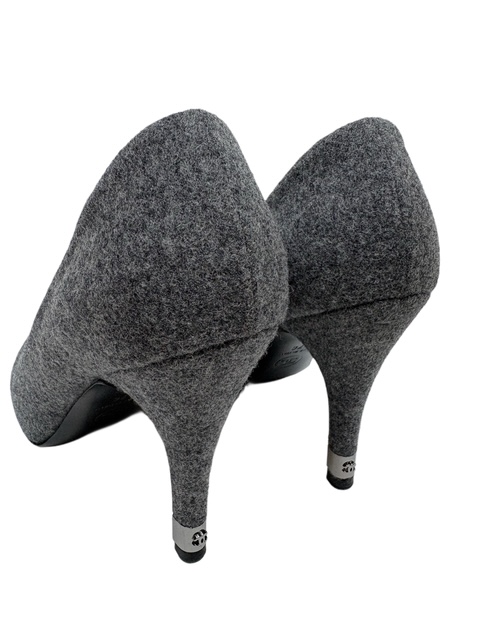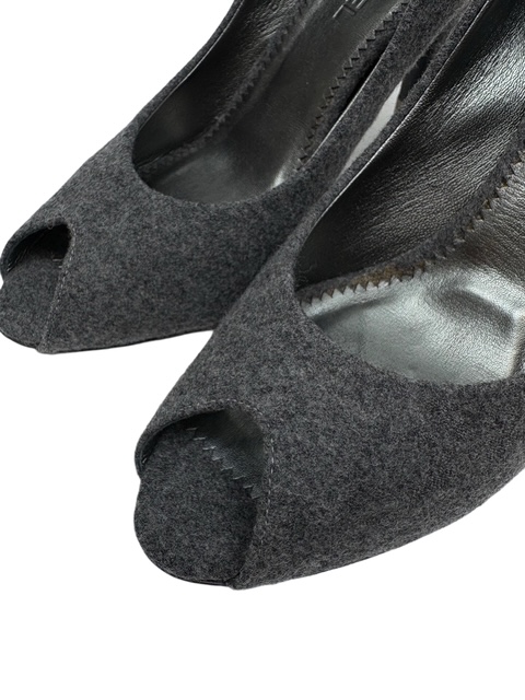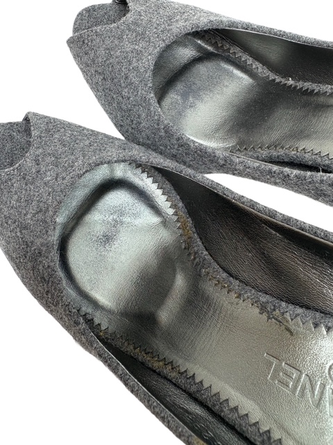 ヒール先にメタルCCプレートが付いたグレーフェルト素材のオープントゥパンプスです♪