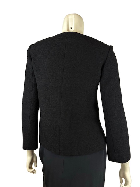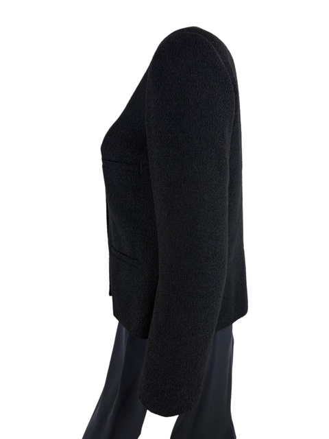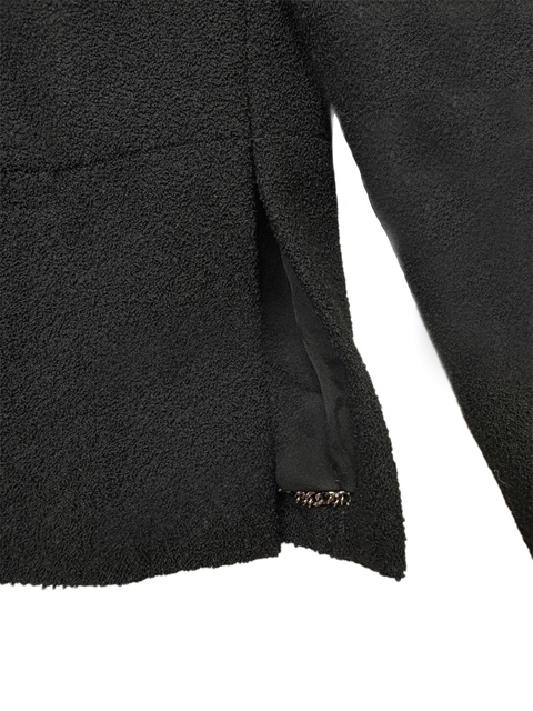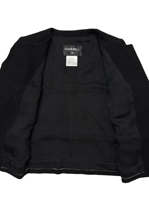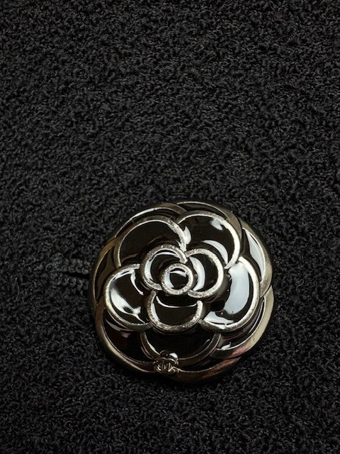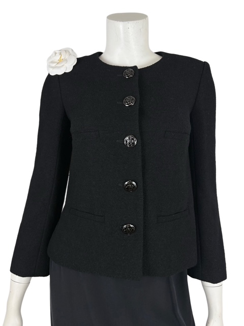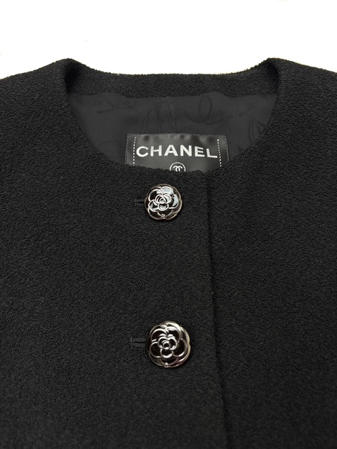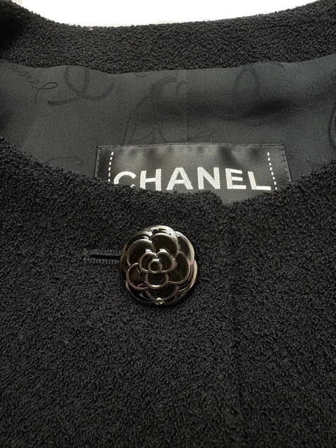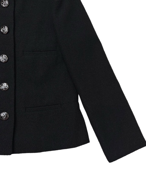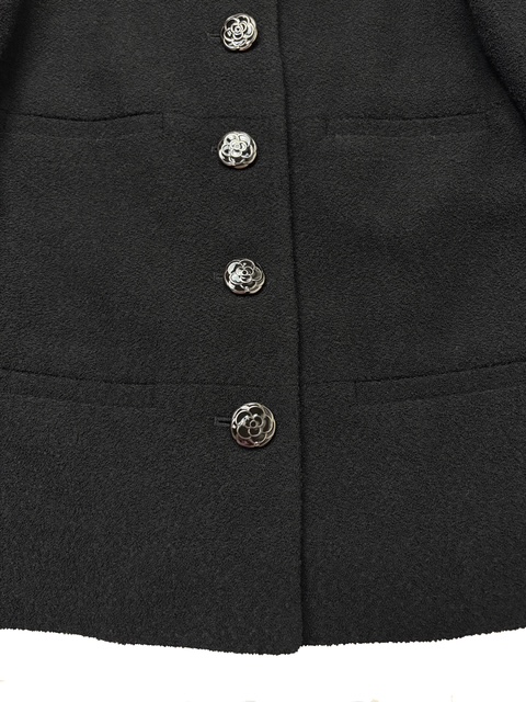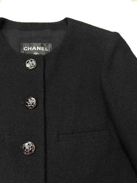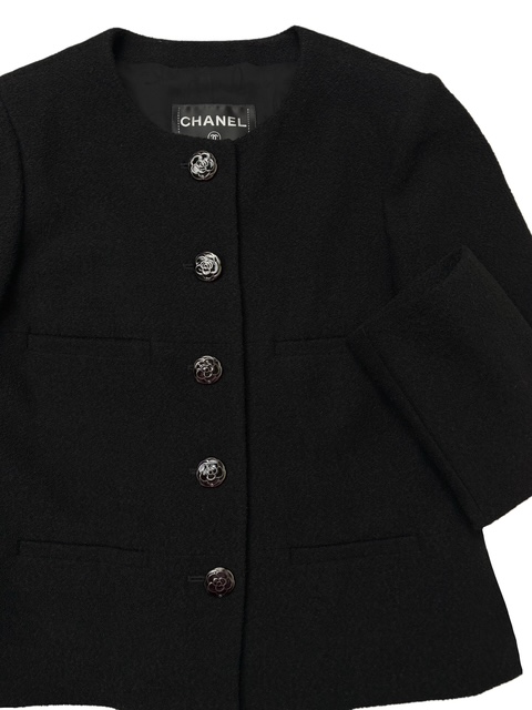 カメリアモチーフのCCボタンが印象的なノーカラージャケットです。普段使いにもフォーマルにも活躍します♪